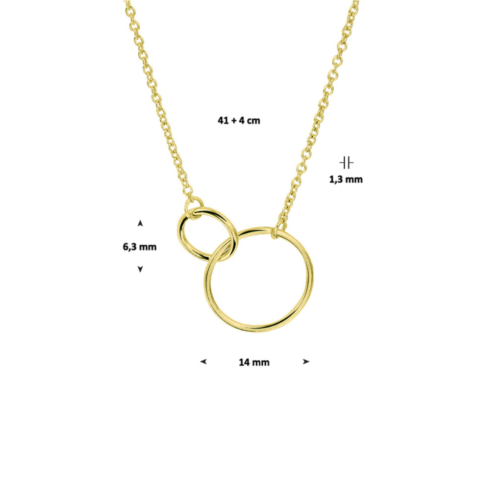 Trendy geelgoud op 925 zilveren 1.2mm anker collier met een lengte van 41cm en een extensie van 4cm uitgevoerd met open cirkels van 8mm en 14mm. Het collier heeft een karabijn sluiting.Tip: Combineer dit collier met bijpassende rondjes sieraden uit onze collectie en maak een trendy en hippe set!