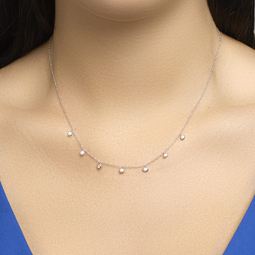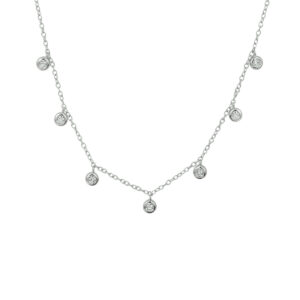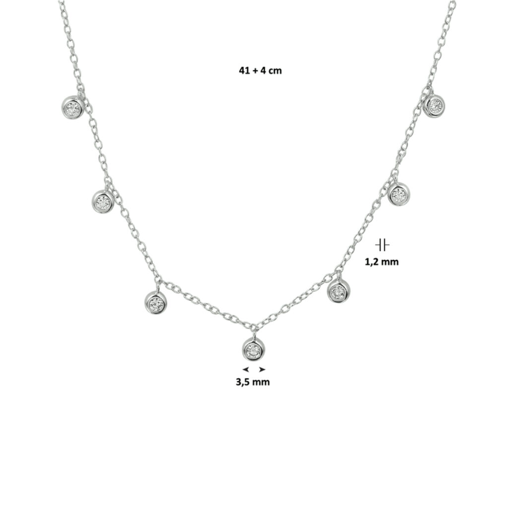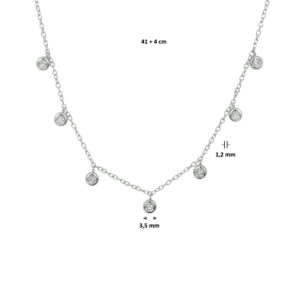 Gerhodineerd 925 zilveren collier met ronde hangers van 3.5mm en heldere zirkonia. Het collier heeft een draaglengte van 41cm en een extensie van 4cm. De schakelbreedte is 1.2mm. Uitgevoerd met een stevige karabijn sluiting. Info: Gerhodineerd zilver is door de rhodiumlaag beter bestand tegen verkleuren en krassen.
