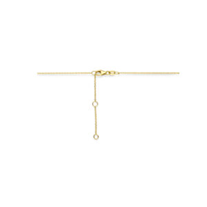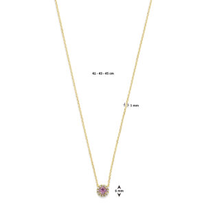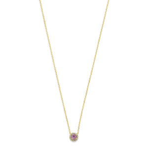 14k Geelgouden collier uitgevoerd met roze saffier en diamant. Het collier heeft draaglengtes van 41-43-45cm. Het totale diamantgewicht is 0.04ct. Uitgevoerd met karabijnsluiting.