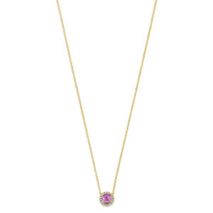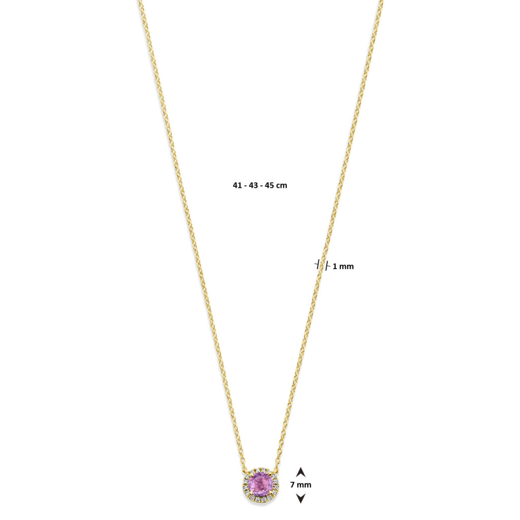 14k Geelgouden collier uitgevoerd met roze saffier en diamant. Het collier heeft draaglengtes van 41-43-45cm. Het totale diamantgewicht is 0.05ct. Uitgevoerd met karabijnsluiting.