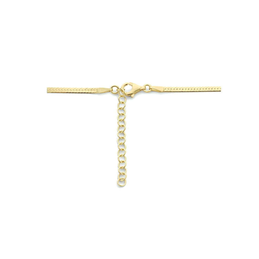 Geelgoud op 925 zilveren collier met een breedte van 2mm. Het collier heeft een draaglengte van 40cm met een extensie van 4cm en een stevige karabijn sluiting.
