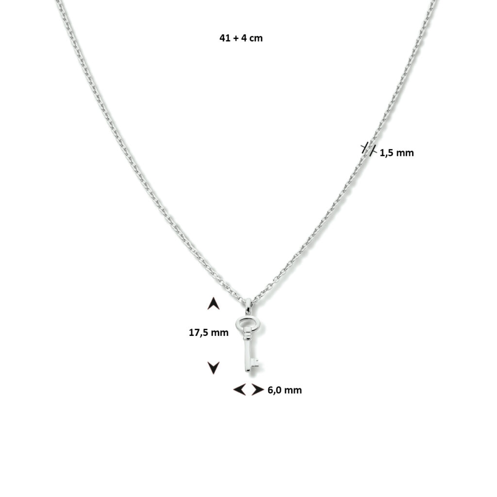 Gerhodineerd 925 zilveren collier uitgevoerd met een hanger in de vorm van een sleutel. Het collier heeft een draaglengte van 41cm met een extensie van 4cm en een stevige karabijn sluiting. Het hangertje heeft een afmeting van 17.5x6mm. De schakelbreedte is 1.5mm.