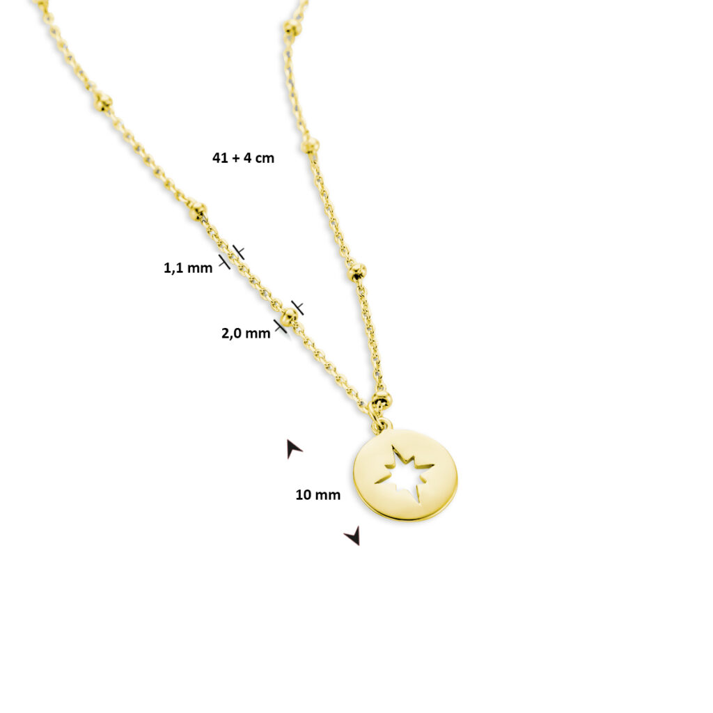 Geelgoud op 925 zilveren collier uitgevoerd met een ronde hanger met daarin een ster. Het collier heeft een draaglengte van 41cm met een extensie van 4cm. De hanger heeft een diameter van 10mm. De schakelbreedte is 2.0mm.