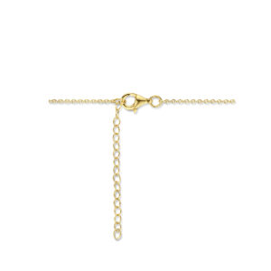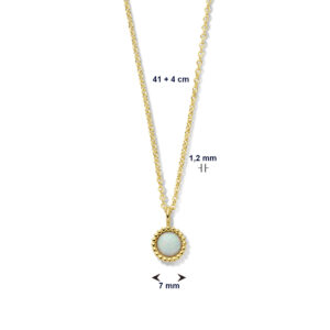 Luxueuze Goudkleurige Collier met Synthetische Opaal steen en Bolletjes Halo – 41 + 4 cm is vervaardigd uit gepolijst 925 Sterling zilver, dat is voorzien van een goudkleurige coating. De collier heeft een metaalgewicht van circa 2,12 gram en wordt gesloten met een karabijnsluiting. De collier bestaat uit anker schakels met een breedte van 1,2 mm, met daaraan een ronde hanger met een totale hoogte van 11 mm en een diameter van 7 mm, die is voorzien van een wit-groene synthetische Opaal steen met een steenmaat van 4,5 mm diameter met een halo van een rij goudkleurige bolletjes. De draaglengte van de collier bedraagt 41 cm met een extensie van 4 cm, waardoor de totale lengte uitkomt op 45 cm.