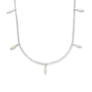 Gerhodineerd 925 zilveren collier met synthetisch opaal. Het collier heeft een schakelbreedte van 1.2mm en is uitgevoerd met karabijnsluiting. De draaglengte is 41cm met een extensie van 4cm.