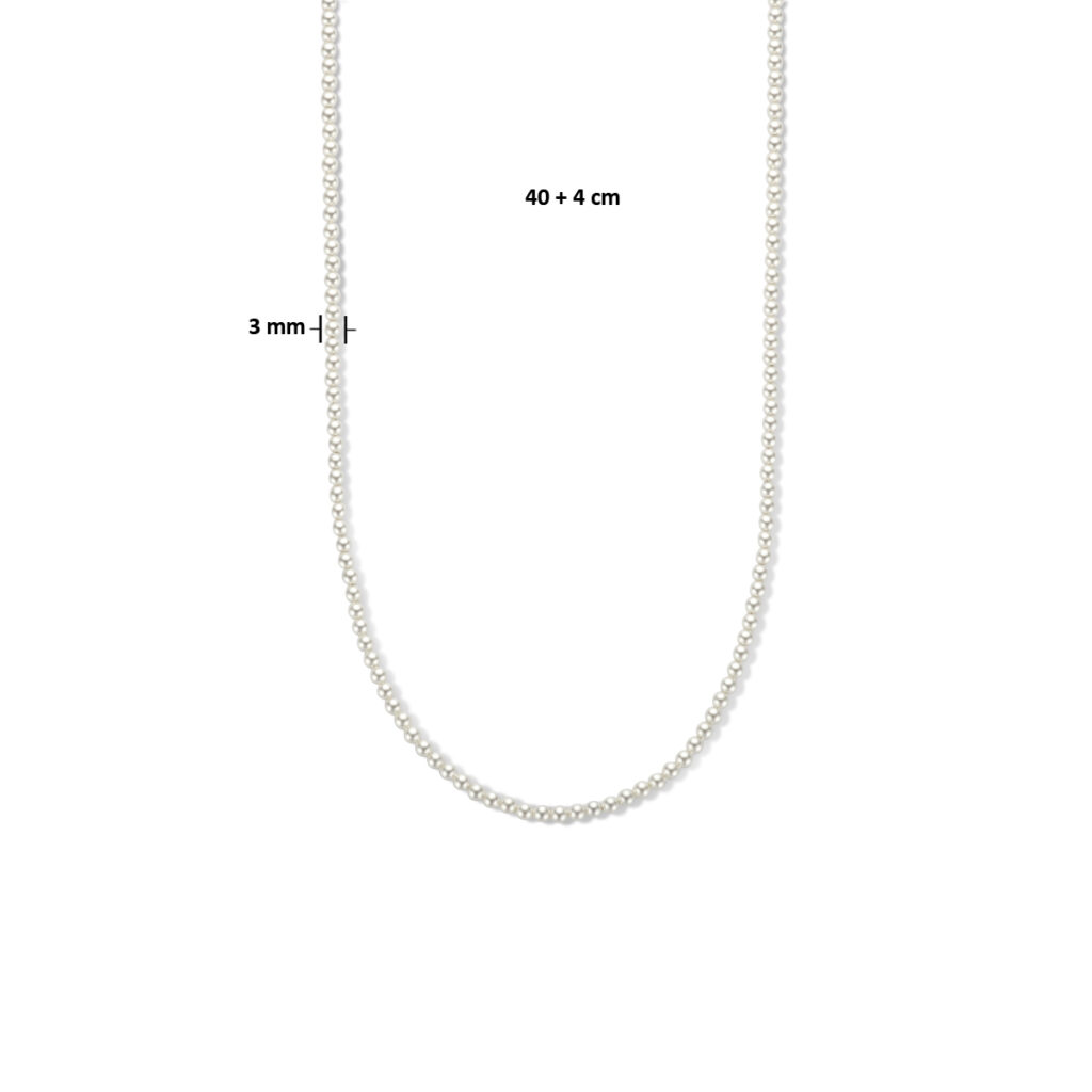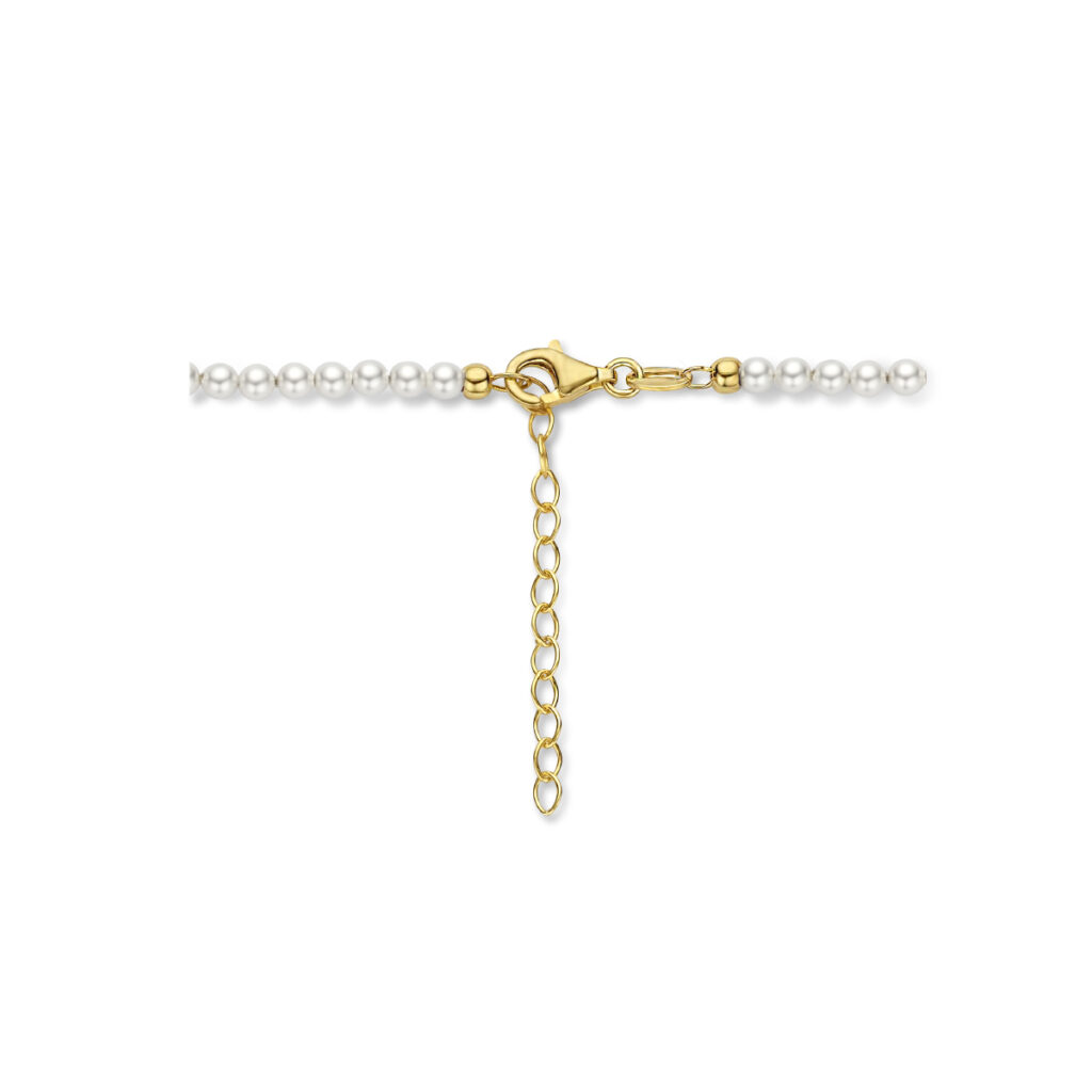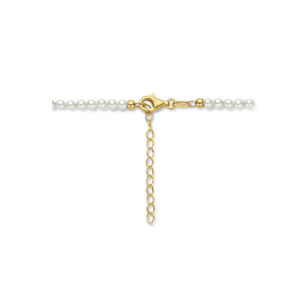 Geelgoud op 925 zilveren collier uitgevoerd met synthetische parels en een karabijn sluiting. Het collier heeft draaglengtes van 40cm met 4cm extensie. De schakelbreedte is 3.0mm. Geen garantie op plating.