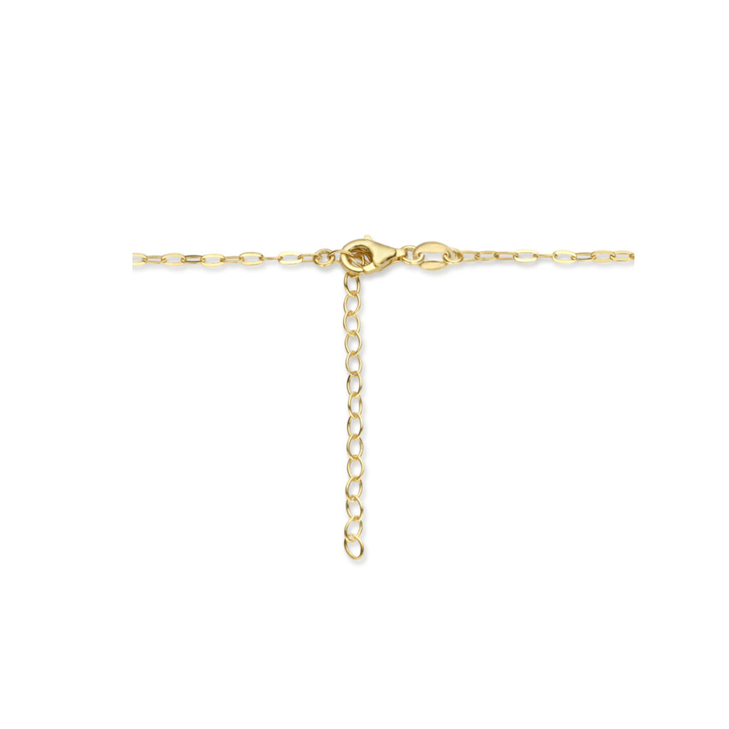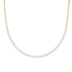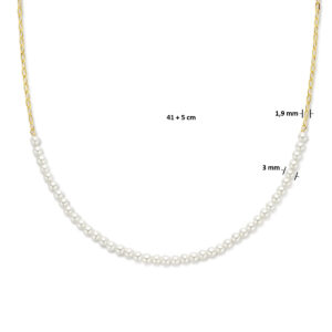 Geelgoud op 925 zilveren collier met synthetische parels. Het collier heeft een draaglengte van 41cm en extensie van 5cm. De schakelbreedte is 1.9mm. Uitgevoerd met een karabijn sluiting. Geen garantie op plating.