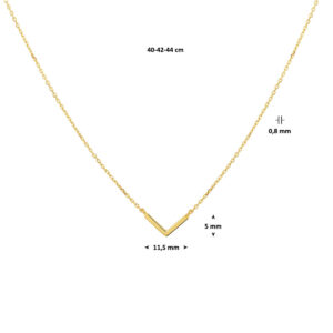 Dit Anker Collier van Geelgoud met V-vormige Hanger is volledig gemaakt van 14 karaats geelgoud, de allerbeste kwaliteit geelgoud, met een gepolijst oppervlak. Dit collier heeft een lengte van 44cm en de hanger heeft een breedte van 11,5mm met een hoogte van 5mm. Dit sieraad bestaat uit een slanke anker ketting van geelgoud met meerdere opengewerkte schakels die fijntjes op elkaar aansluiten, met onderaan een V-vormige hanger. Dit collier is voorzien van een fijntjes gepolijst oppervlak dat mooi glanst, met aan de achterkant een handige sluiting, waarmee u dit collier gemakkelijk om- en afdoet. Deze hanger is geschikt voor dames en is bijzonder leuk als cadeau. Dit sieraad zal tevens niet misstaan op bijvoorbeeld een luxe gala of een black-tie event. Deze hanger behoort tot onze huiscollectie, waardoor u verzekerd bent van de allerbeste kwaliteit tegen de scherpste prijs!
