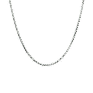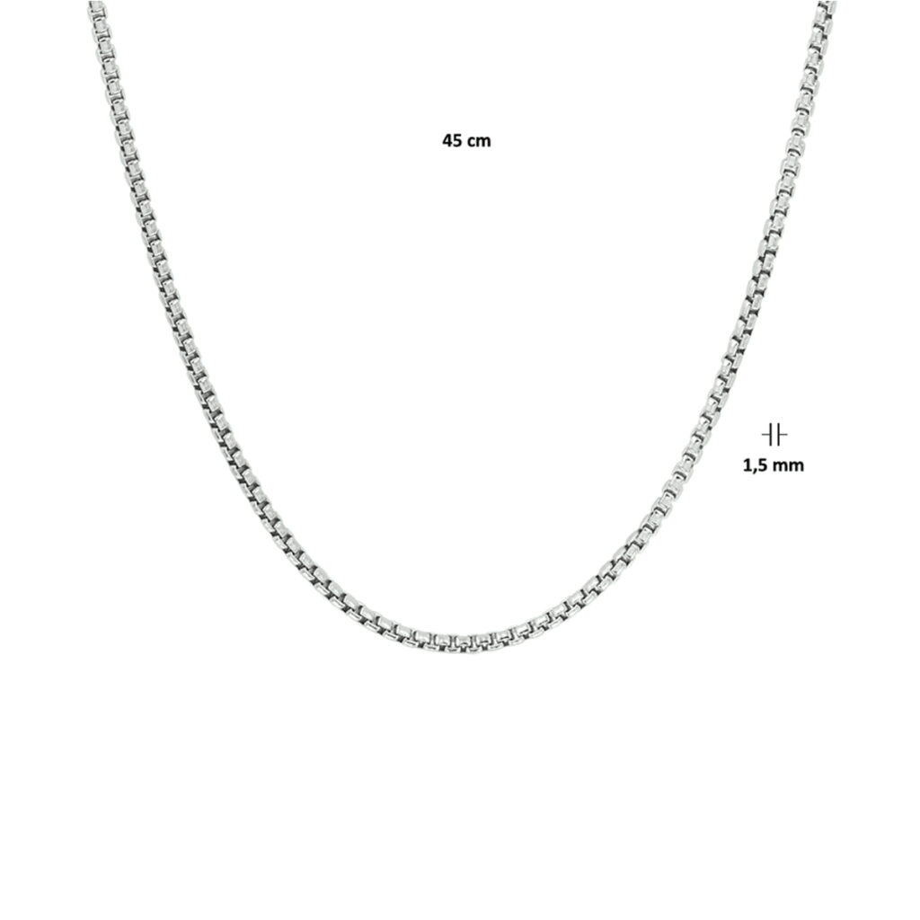 Gerhodineerd zilveren collier met een venetiaanse schakel van 1.5mm. Het collier heeft een draaglengte van 42cm en is uitgevoerd met een stevige karabijn sluiting. Info: Gerhodineerd zilver is door de rhodiumlaag beter bestand tegen verkleuren en krassen.