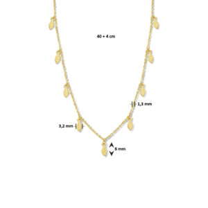 Dit schitterende collier is volledig gemaakt van 925 sterling zilver, de allerbeste kwaliteit zilver, met een goudkleurige coating en een fijntjes gepolijst oppervlak dat mooi glanst. Het sieraad bestaat uit fijne ankerschakels, met aan de voorkant meerdere veren. Aan de achterkant zit een stevige karabijn sluiting, waarmee u het collier gemakkelijk om- en afdoet. Verder heeft het collier een draaglengte van 40 cm met daaraan een verlengstukje van 4 cm, waardoor de totale lengte 44 cm bedraagt.
