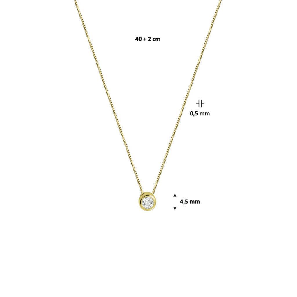 14k Geelgouden collier met zirkonia in een zetkast met een diameter van 4.5mm. De lengte bedraagt 40cm met 2cm extensie en de schakelbreedte is 0.5mm.