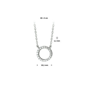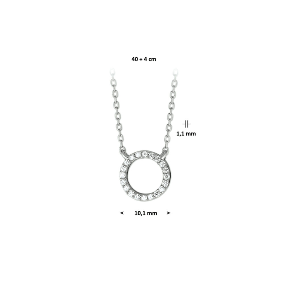 Gerhodineerd zilveren collier met open cirkel en zirkonia. Het collier is onderdeel van een set. De lengte van het collier bedraagt 40cm met 4cm extensie. De schakelbreedte bedraagt 1.1mm.