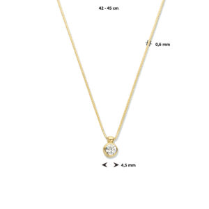 14k Geelgouden collier uitgevoerd met een hanger met daarin een schitterende zirkonia. Het collier heeft draaglengtes van 42 en 45cm. De hanger heeft een diameter van 4.5mm. De schakelbreedte is 0.6mm.