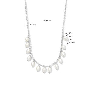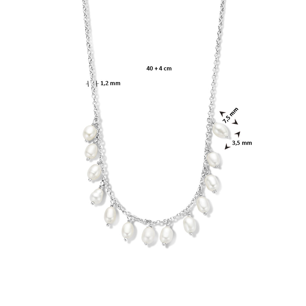Gerhodineerd 925 zilveren collier uitgevoerd met zoetwaterparels en een karabijnsluiting. Het collier heeft een schakelbreedte van 1.2mm en een draaglengte van 40cm met 4cm extensie.