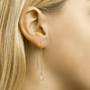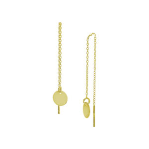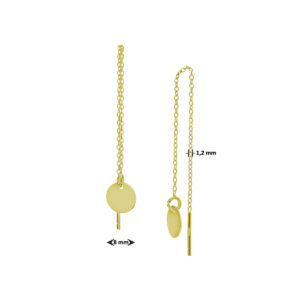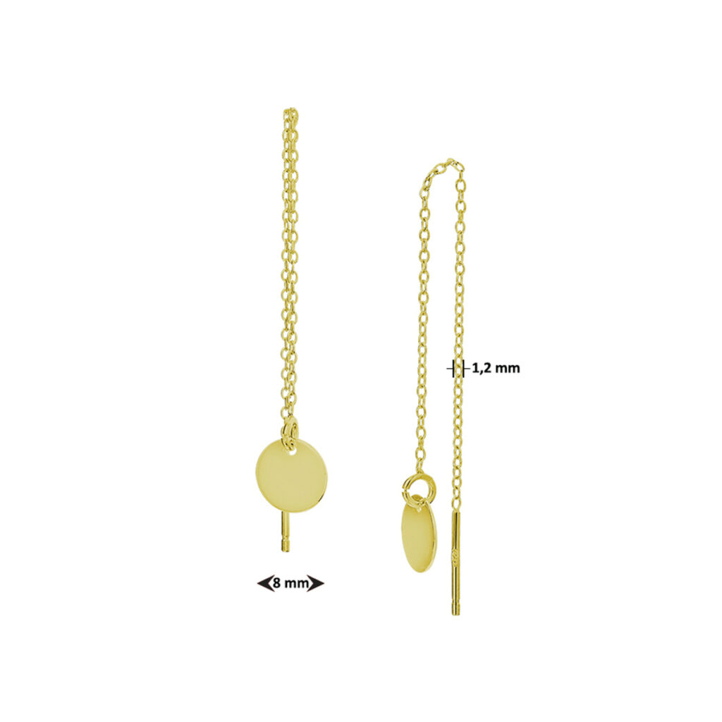 Geelgoud op 925 zilveren doortrekoorbellen uitgevoerd met een rondje. De oorbellen hebben een totale lengte van 9cm. Het rondje heeft een diameter van 8mm. Van deze doortrekoorbellen is een variant met 1 micron goud plating beschikbaar. Onderaan deze pagina vindt u dit artikel.