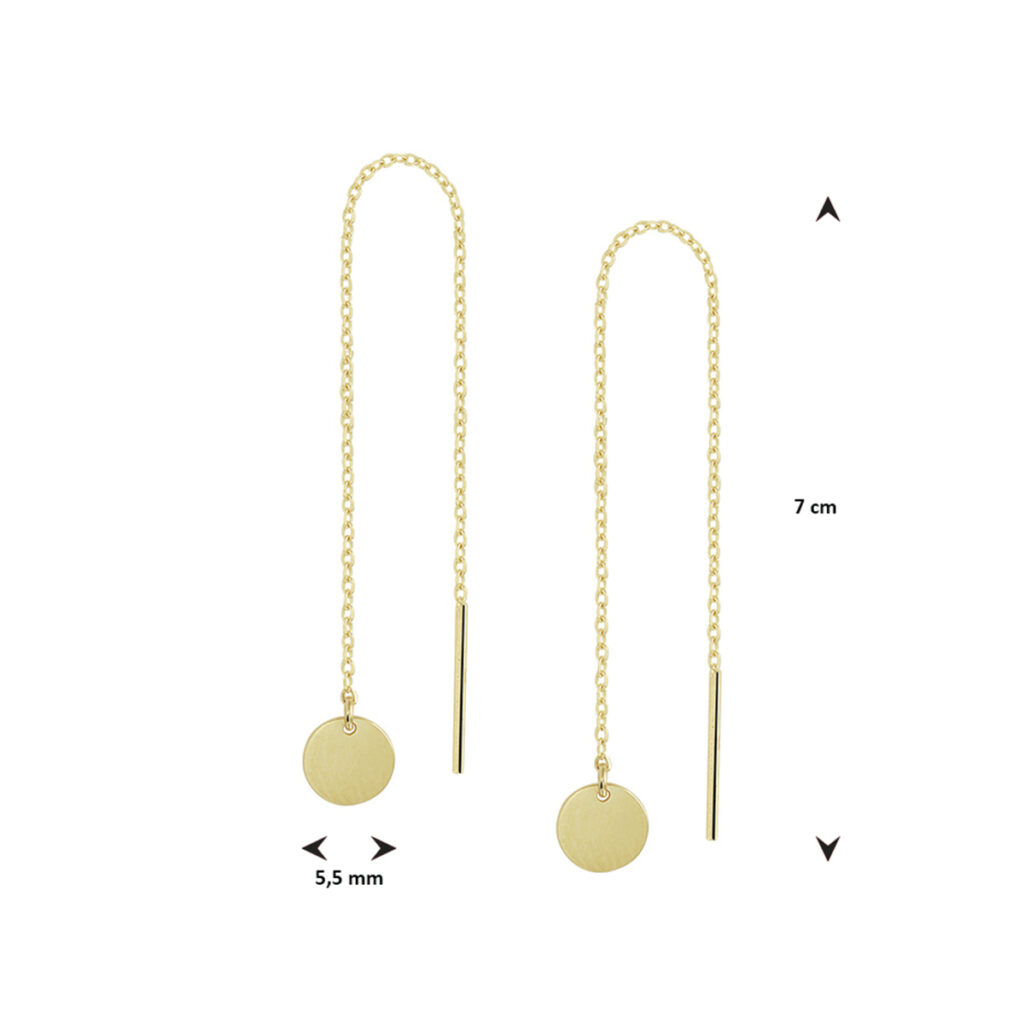 Deze gouden oorbellen voor dames van Gepolijst Geelgoud met Ronde Plaatjes zijn volledig gemaakt van 14 karaats geelgoud, de allerbeste kwaliteit geelgoud, met een gepolijst oppervlak. Deze oorhangers hebben een breedte van 5,5mm met een hoogte van 70mm. Dit sieraad bestaat uit een slanke schakelketting met aan het ene uiteinde een kort staafje, met aan de voorkant een rond plaatje. Deze doortrekoorbellen zijn geschikt voor dames en zijn bijzonder leuk als cadeau. Dit sieraad zal tevens niet misstaan op bijvoorbeeld een luxe gala of een black-tie event. Deze doortrekoorbellen behoren tot onze huiscollectie, waardoor u verzekerd bent van de allerbeste kwaliteit tegen de scherpste prijs!