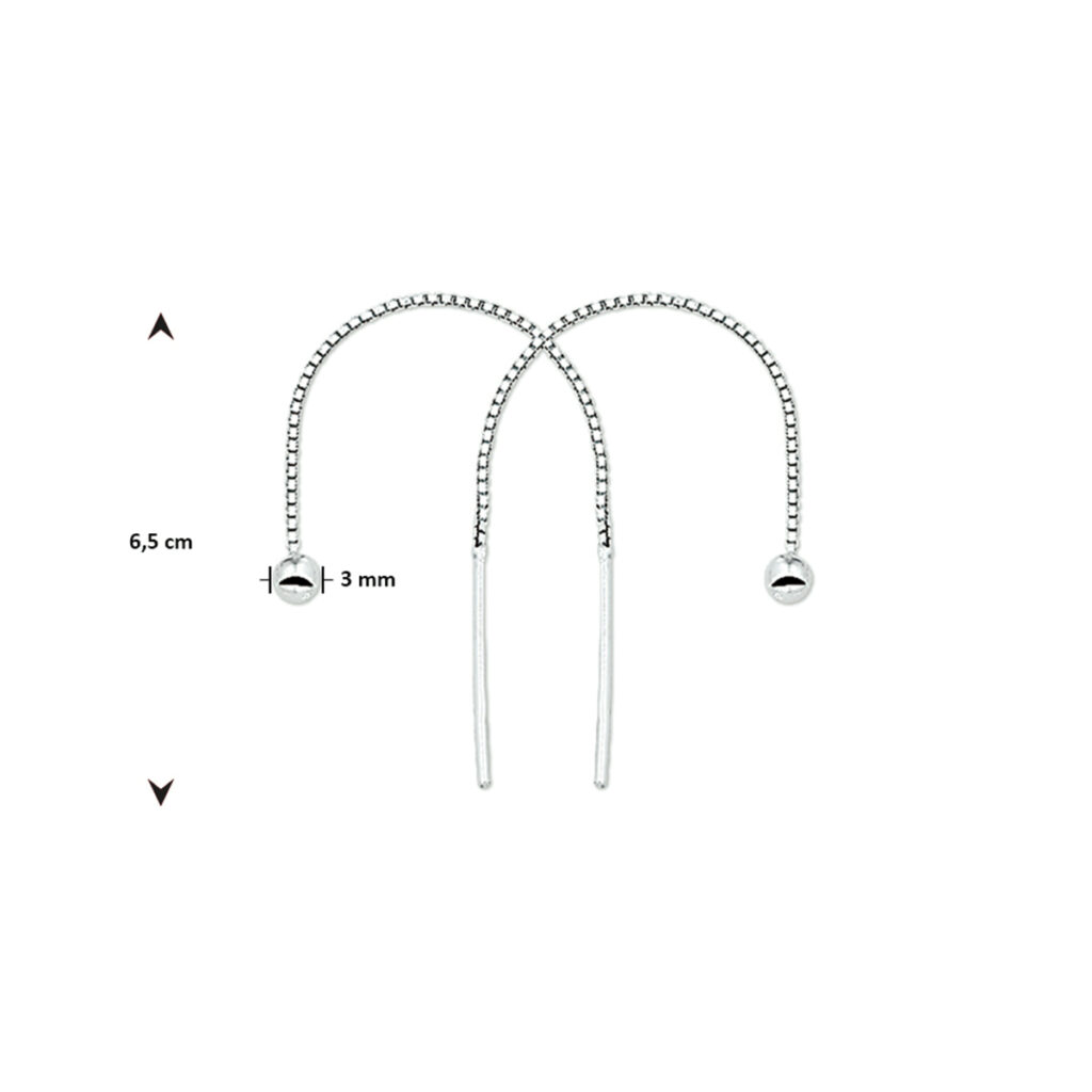 Deze Zilveren Doortrekoorbellen met Bolletjes en Staafjes zijn volledig gemaakt van 925 sterling zilver, de allerbeste kwaliteit zilver, met een mooi gepolijst oppervlak. Deze zilveren doortrekoorbellen zijn voorzien van een slanke schakelketting met aan de uiteinden een bolletje en aan de andere uiteinden een langwerpig staafje. Deze doortrekoorbellen hebben een lengte van 65mm en hebben een zeer luxueuze uitstraling die niet snel zal gaan vervelen en bijzonder leuk is als cadeau. Deze doortrekoorbellen zijn speciaal voor dames.