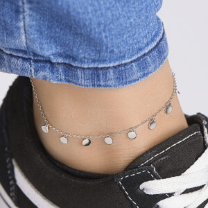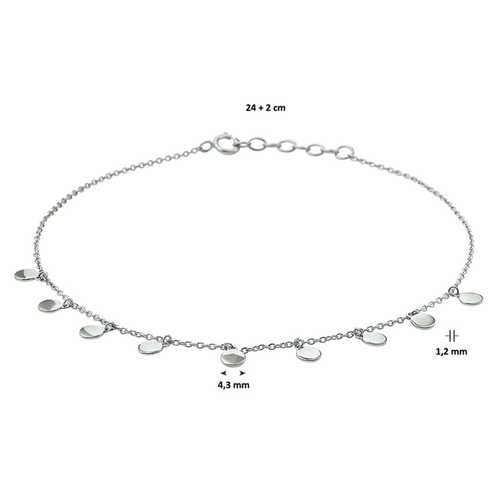 Trendy gerhodineerd zilveren enkelbandje uitgevoerd met ronde hangers van 4.3mm in diameter. Met een draaglengte van 24cm en een extensie van 2cm. Het enkelbandje is te combineren met bijpassende sieraden uit onze collectie. Info: Gerhodineerd zilver is door de rhodiumlaag beter bestand tegen verkleuren en krassen.