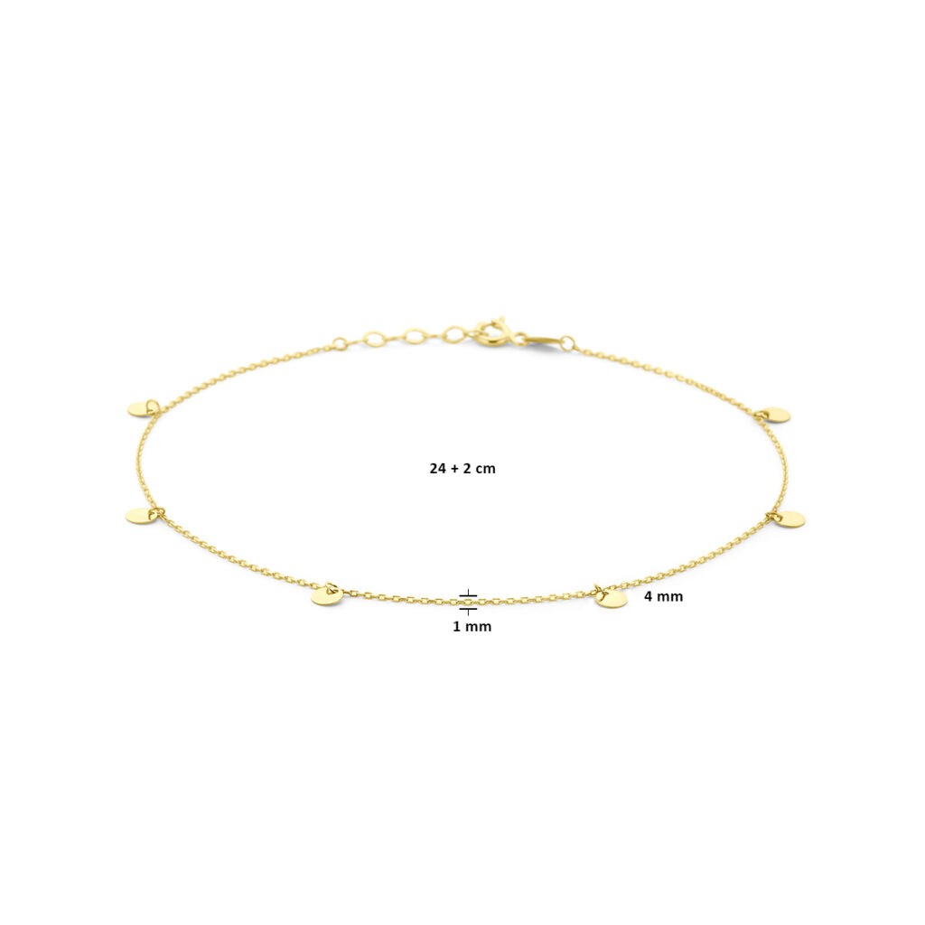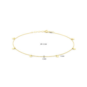14k gouden enkelbandje uitgevoerd met rondjes en een karabijn sluiting. Het enkelbandje heeft een draaglengte van 24cm met een extensie van 2cm. De rondjes hebben een diameter van 4mm. De schakelbreedte is 1.0mm.