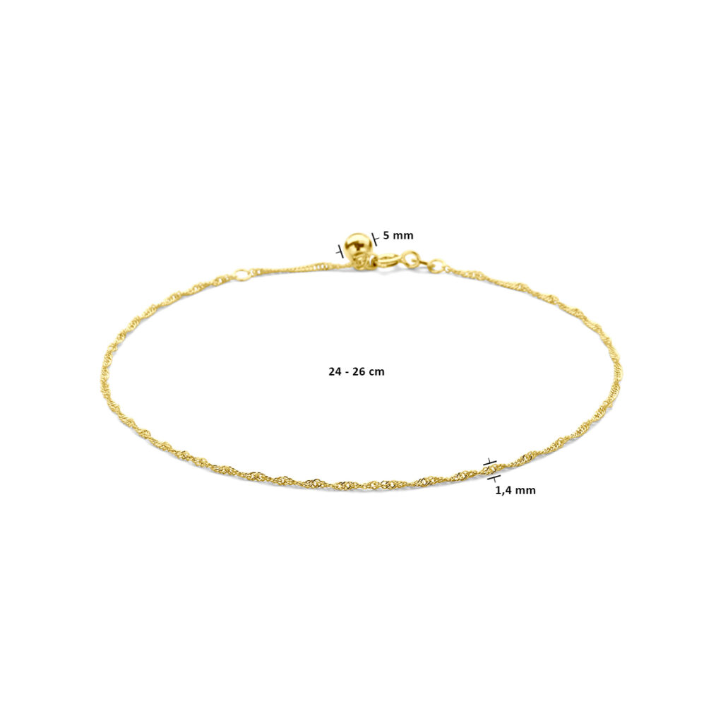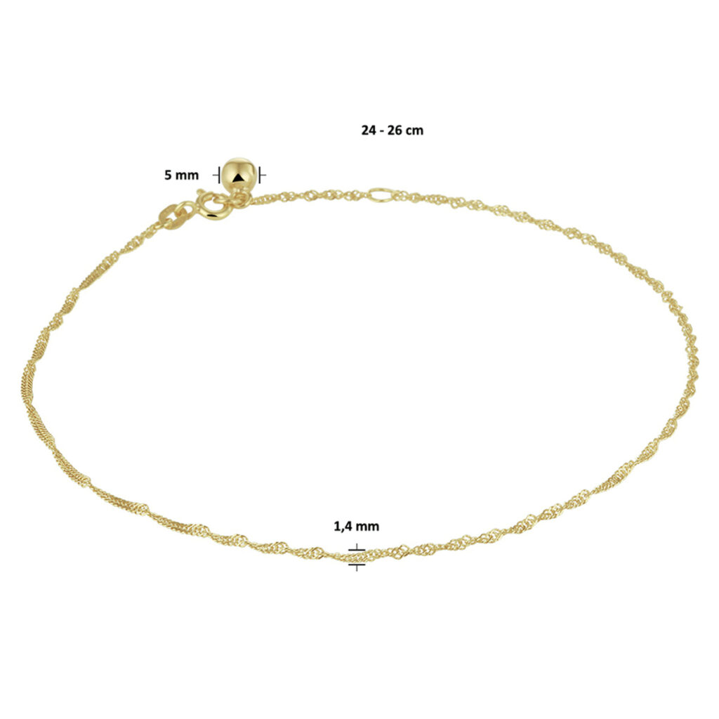 Deze singapore schakel enkelband is gemaakt van 14 karaats geelgoud, de allerbeste kwaliteit goud, met een fijntjes gepolijst oppervlak dat mooi glanst. Dit gouden enkelbandje bestaat uit meerdere singapore schakels die fijntjes op elkaar aansluiten en die samen een stijlvol geheel vormen, met aan de achterkant een handige karabijnsluiting en een klein subtiel balletje waardoor u deze enkelbandje gemakkelijk om- en afdoet. Verder heeft het enkelbandje een draaglengte van 24 cm met daaraan een verlengstukje van 2 cm, waardoor de totale lengte 26 cm bedraagt.