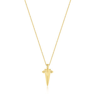Voeg een vleugje punkrock toe aan je sieradenlook met deze chique geometrische hanger aan een delicate ketting. De hanger is voorzien van dubbele studs en heeft een puntig ontwerp dat aansluit bij de futuristische, hoekige sieraden trend van dit seizoen. De hanger is gemaakt van 14kt verguld sterlingzilver en past perfect bij de bijpassende spike studs.