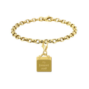 Deze Gouden Bedel Baby Kalender van Names4ever is vervaardigd uit 14 karaat geelgoud, waarop de geboortedatum van maximaal 20 tekens kan worden gegraveerd. De Baby Bedel is voorzien van een karabijnsluiting, waarmee de bedel eenvoudig aan een bedel armband bevestigd kan worden aan en net zo eenvoudig kan worden verwijderd hiervan. De bedel is 14 mm lang bij 11 mm breed en 0,4 mm dik. De bedel wordt geleverd in een mooi cadeauverpakking.