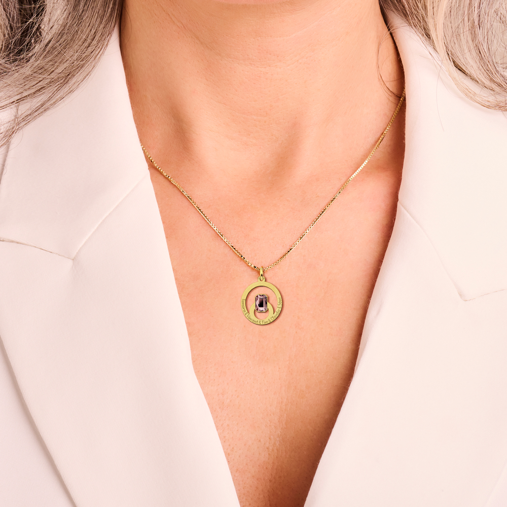 Deze Gouden Ronde Hanger met Kleurige Baguette Swarovski is vervaardigd uit 14 karaats goud in de vorm van een rondje in een rondje met op het onderste rondje een baguette vormige Swarovski steen in de kleur: Aquamarijn, Kristal, Kristal Geel, Smaragd, Roze, Scarlett of Scarlett Glans. De hanger heeft een afmeting van 20 x 21 mm bij een dikte van 0,6 mm en kan worden voorzien van een gravure van maximaal 55 tekens.