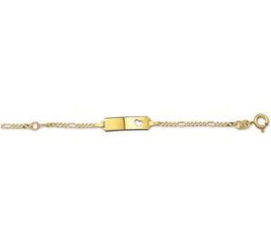 Deze schitterende armband is gemaakt van 14 karaat goud, dat bestaat uit 58,5% goud. Het sieraad is gepolijst, wat zorgt voor een mooie glanzende afwerking. De armband bestaat uit figaro schakels die samen een stijlvol geheel vormen. Aan de voorkant van de armband zit een langwerpig graveerplaatje, met aan de rechterzijde een uitsparing van een klein hartje. Het graveerplaatje is groot genoeg om een naam of bijvoorbeeld datum op te laten graveren. De armband heeft een draaglengte van 9 cm met daaraan een verlengstukje van 2 cm, waardoor de totale lengte 11 cm bedraagt.