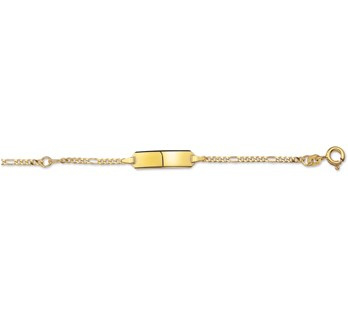Deze kinderarmbandje is gemaakt van 14 karaat goud, dat bestaat uit 58,5% goud. Het sieraad is gepolijst, wat zorgt voor een mooie glanzende afwerking. De armband bestaat uit figaro schakels die samen een stijlvol geheel vormen. Aan de voorkant van de armband zit een langwerpig graveerplaatje. Het graveerplaatje is groot genoeg om een naam of bijvoorbeeld datum op te laten graveren. De armband heeft een draaglengte van 9 cm met daaraan een verlengstukje van 2 cm, waardoor de totale lengte 11 cm bedraagt.