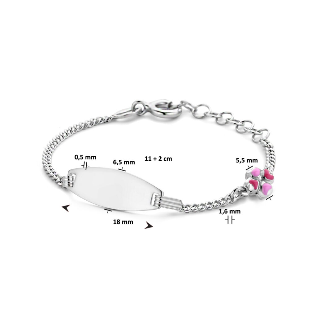 Deze leuke Zilveren Graveerarmband Ovaal met Klavertjevier is vervaardigd uit gepolijst 925 Sterling zilver, dat is voorzien van een gerhodineerde coating. De armband is opgebouwd uit Gourmette schakels met een schakelbreedte van 1,6 mm en heeft een metaalgewicht van circa 1,91 gram. De draaglengte van deze armband is 11 cm met een extensie van 2 cm. In het midden van de kinderarmband is een ovaal graveerplaatje met een lengte van 6,5 mm en een breedte van 18 mm bij een dikte van 0,5 mm en een lichtroze met donkerroze emaille klavertjevier bevestigd met een hoogte van 5,5 mm en een breedte van 5,5 mm. De armband wordt gesloten met een karabijnsluiting.