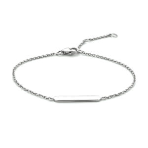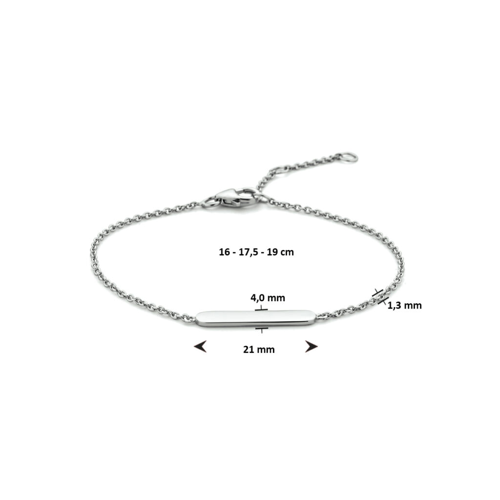 Deze leuke armband is gemaakt van 925 sterling zilver, de allerbeste kwaliteit zilver, met een fijntjes gepolijst oppervlak dat mooi glanst en een laagje rhodium waardoor die glans extra lang behouden blijft. De armband bestaat uit meerdere fijne ankerschakels van 1,3 mm breed met aan de voorkant een langwerpig graveerplaatje. Het graveerplaatje heeft een afmeting van 4 mm x 21 mm. Dit is groot genoeg om een naam naar keuze of bijvoorbeeld een datum op te laten graveren. Zo bent u verzekerd van een persoonlijk en uniek sieraad. Aan de achterkant zit een stevige karabijn sluiting, waarmee u de armband eenvoudig om- en af doet. Het is ook mogelijk om de armband in lengte te verstellen, dit is mogelijk van 16, 17,5 en 19 cm.