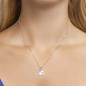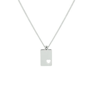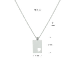 Deze mooie graveerketting is volledig gemaakt van 925 sterling zilver, de allerbeste kwaliteit zilver met een laagje rhodium, wat ervoor zorgt dat de glans extra lang behouden blijft. Het sieraad bestaat uit fijne gourmette schakels met een schakelbreedte van 1 mm, die mooi op elkaar aansluiten en samen een stijlvol geheel vormen. Aan de voorzijde heeft het sieraad een rechthoekige hanger, deze heeft een afmeting van 9 x 17 mm en is uitgevoerd met de uitparing van een klein hartje. Daarnaast kan dit hangertje gegraveerd worden met een persoonlijke gravering naar keuze. Verder heeft het sieraad een draaglengte van 40 cm met daaraan een verlengstukje van 5 cm, waardoor de totale lengte 45 cm bedraagt.