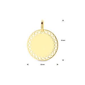14k Geelgouden graveerhanger met een diameter van 16mm en een dikte van 0.6mm.