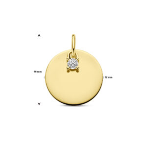 14k Geelgouden graveerhanger uitgevoerd met een cirkel en een diamant. De dikte van de plaat is 0.5mm.
