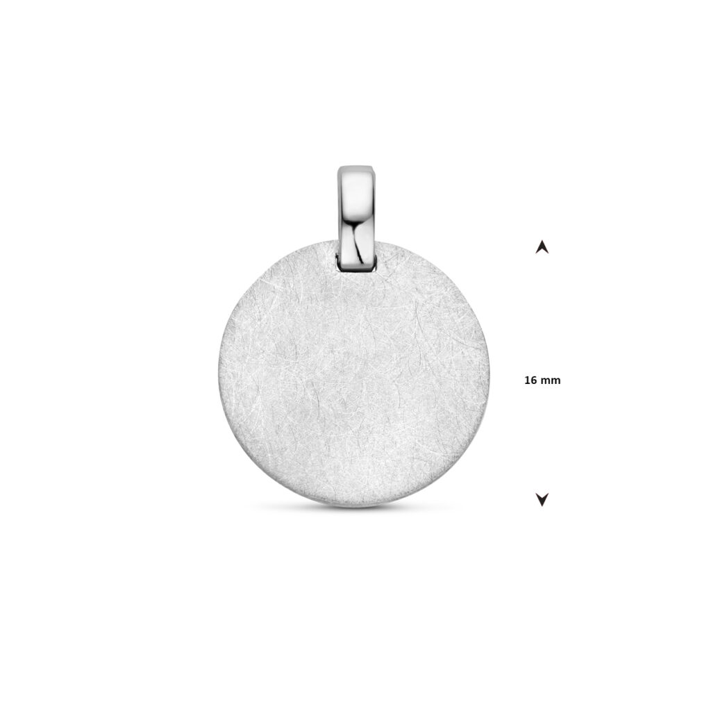 Gerhodineerd 925 zilveren graveerhanger met een totale hoogte van 20mm uitgevoerd in ijsmat. De hanger heeft een totale hoogte van 16mm en een dikte van 1,2mm.