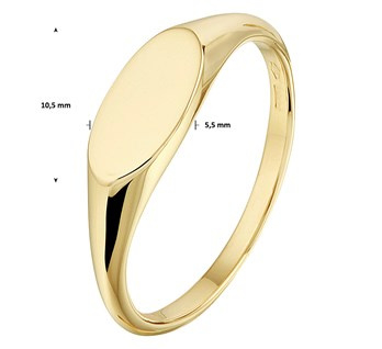 Deze zegelring is volledig gemaakt van 14 karaats geelgoud, de allerbeste kwaliteit geelgoud, en voorzien van een gediamanteerde bewerking voor een mat oppervlak alsook een gepolijste bewerking voor een glanzend oppervlak. Deze ring bestaat uit een slanke bolstaande strook geelgoud met een gepolijst oppervlak dat mooi glanst, met aan de voorkant een ovaalvormig plaatje dat voorzien is van een gediamanteerde bewerking. Op dit langwerpige ovaalvormige plaatje zou een initiaal, naam of datum naar keuze gegraveerd kunnen worden, voor een extra persoonlijk en uniek sieraad. Deze ring heeft een slanke uitstraling die gemakkelijk gecombineerd kan worden met een grote diversiteit aan sieraden. Deze zegelring is uiteraard verkrijgbaar in diverse ringmaten met aan de voorkant een kopstuk met een breedte van 5,5mm.