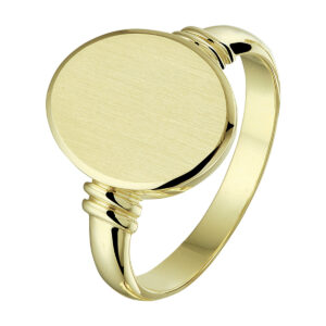 Stijlvolle geelgouden massieve graveerring met een afmeting van 15.5×12.5mm. De gediamanteerde afwerking en de robuuste afkanting maken de ring helemaal af.