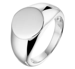 Deze stevige zegelring is volledig gemaakt van 925 sterling zilver, de allerbeste kwaliteit zilver, en voorzien van een gepolijst oppervlak dat mooi glanst met een laagje rhodium waardoor die glans extra lang behouden blijft. Deze ring bestaat uit een slanke bolstaande strook zilver die naar de voorkant steeds breder loopt, met aan de voorkant een robuust ovaalvormig plaatje. Op dit ovaalvormige kopstuk zou een initiaal of een klein logo naar keuze gegraveerd kunnen worden, voor een extra persoonlijk en uniek sieraad. Deze ring heeft een robuuste uitstraling en valt daardoor goed op. Deze zegelring is uiteraard verkrijgbaar in diverse ringmaten met aan de voorkant een kopstuk met een afmeting van 11,5×12,5mm.
