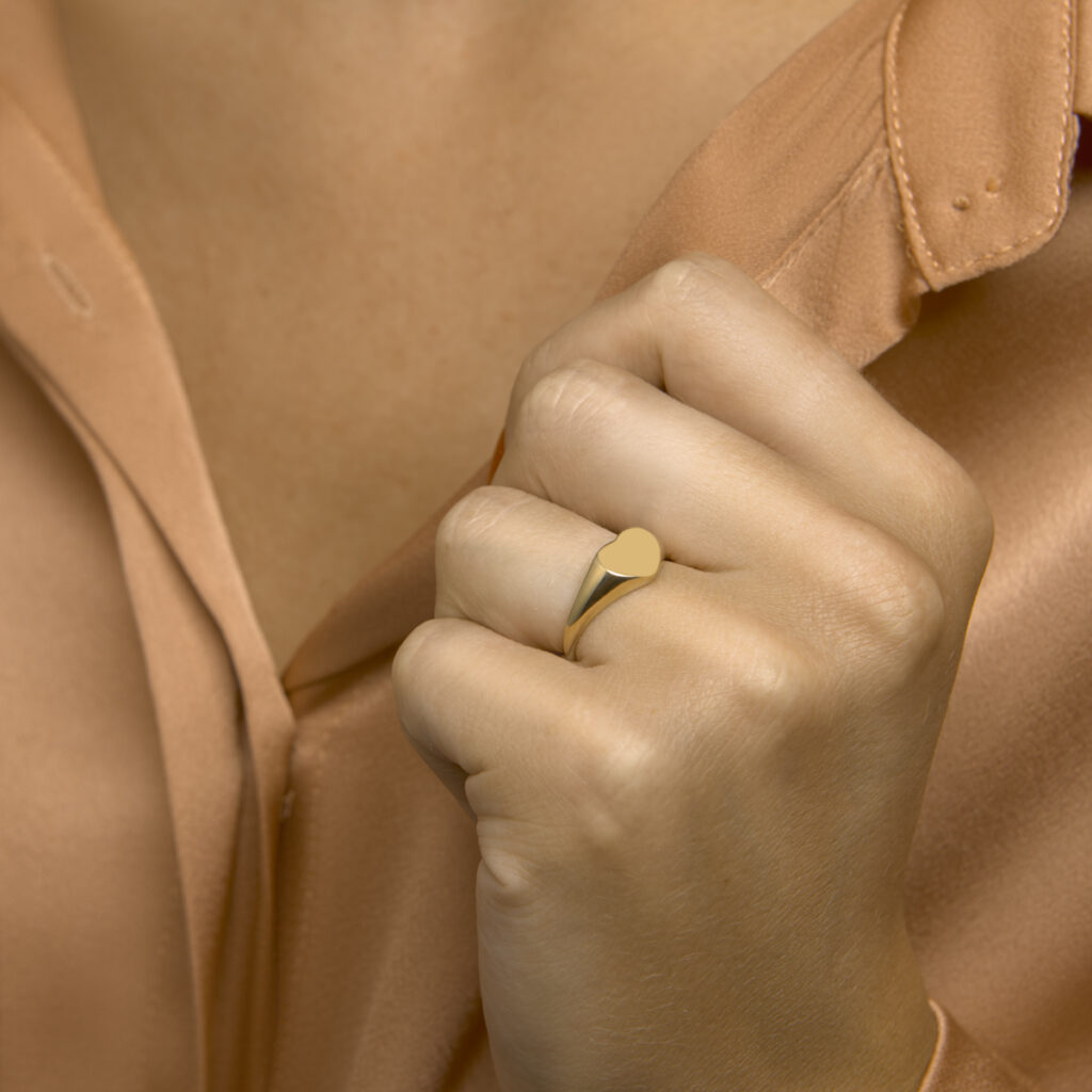 14k Geelgouden graveerring uitgevoerd met een hartje. De ring heeft een breedte van 9.5mm.
