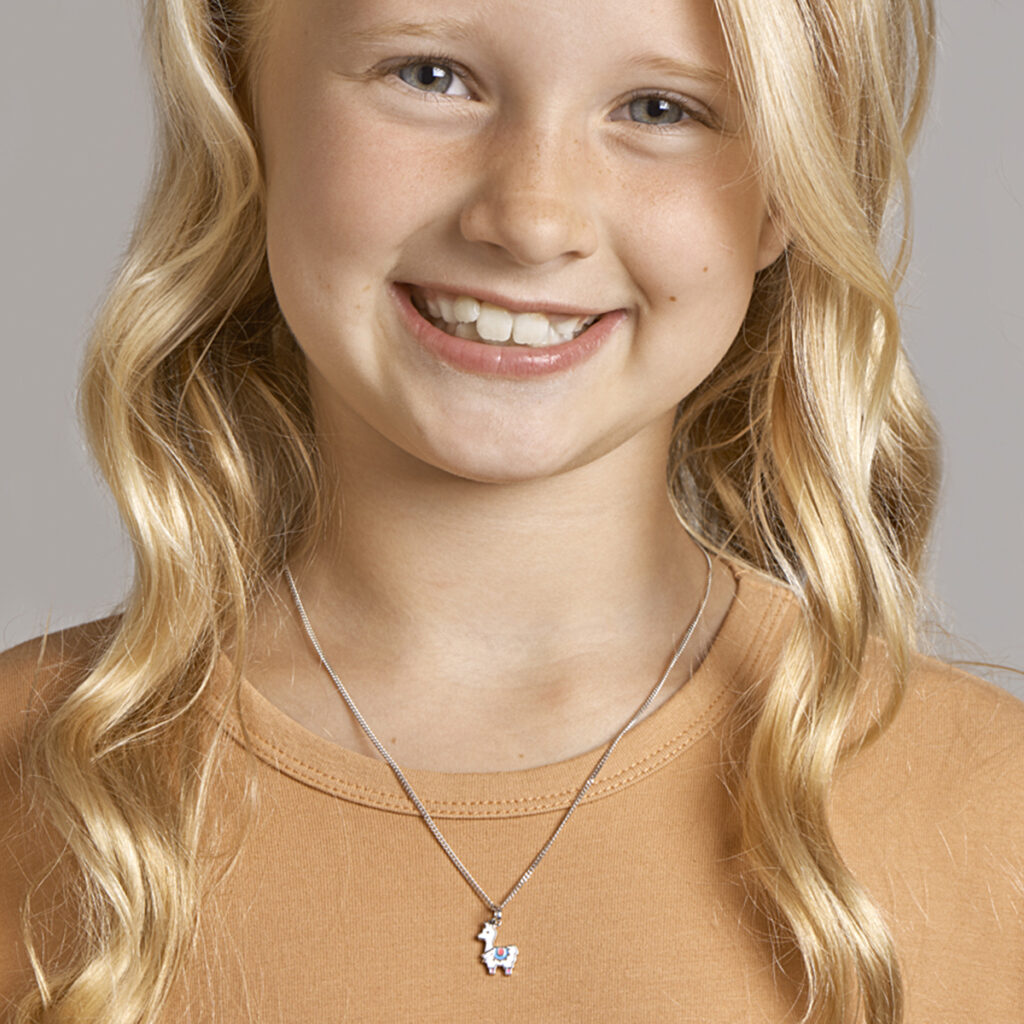Gerhodineerd zilveren hanger in de vorm van een alpaca uitgevoerd met emaille. De hanger heeft een totale hoogte van 19mm.