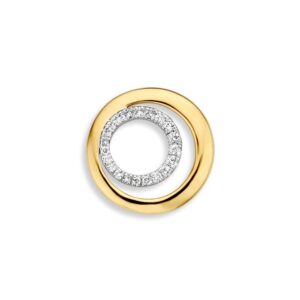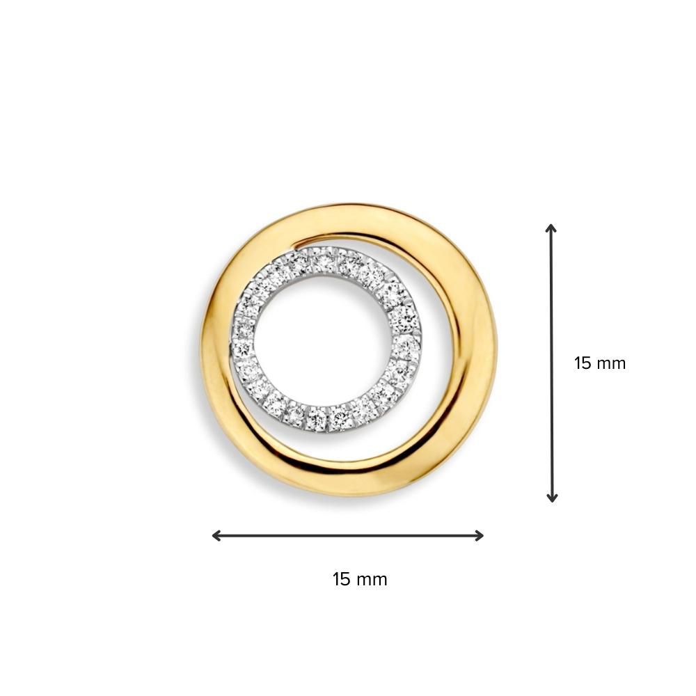 Deze hanger is afkomstig van het merk Excellent Jewelry dat alweer 25 jaar een toonaangevende Nederlandse sieradenleverancier en vaste partner van vele Nederlandse juweliershuizen is. Zo is dit sieraad gemaakt van geelgoud met witgoud en bestaat de hanger uit een opengewerkte cirkel van geelgoud, met in het midden een opengewerkte cirkel van witgoud die volledig is bedekt met meerdere kleurloze briljanten die mooi glinsteren en een totaal karaatgehalte hebben van 0,11 crt. De hanger heeft een diameter van 14mm en heeft een gewicht van 1,6 gram.