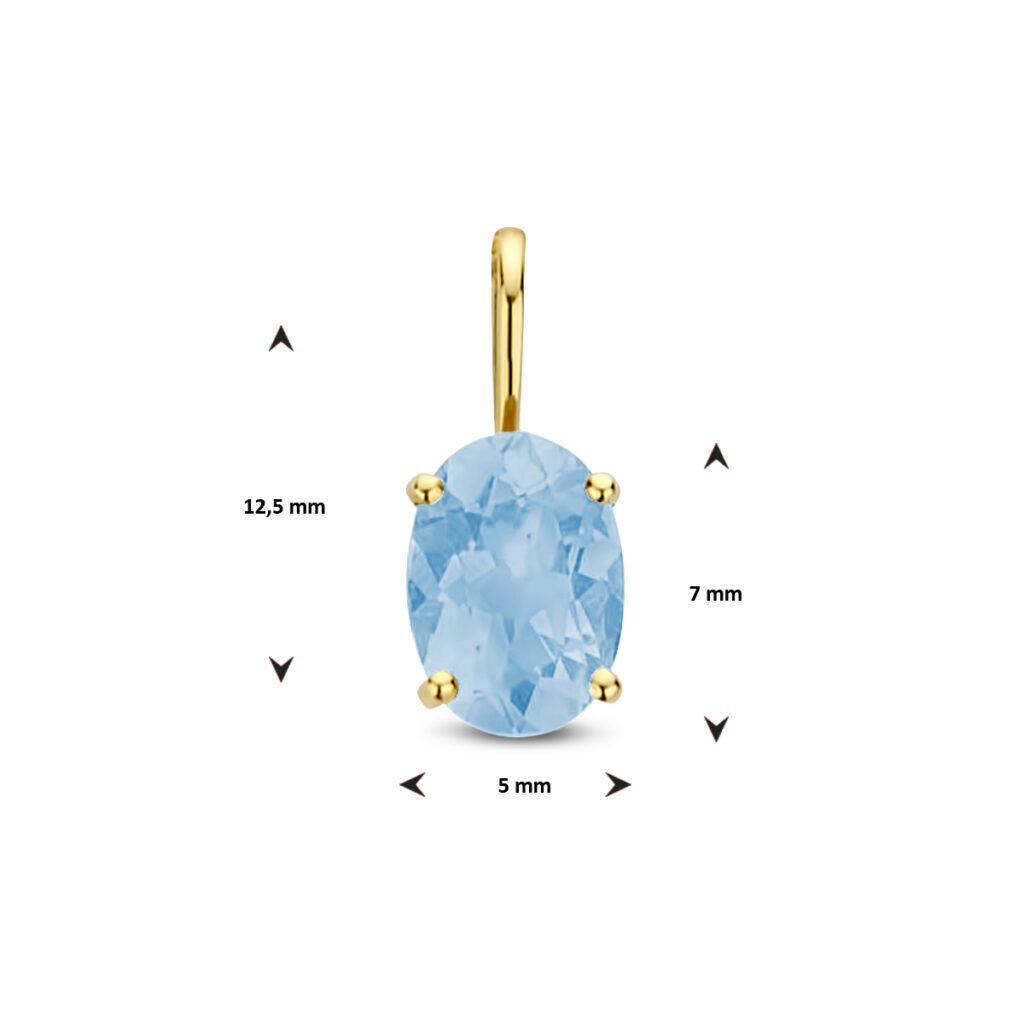 Deze elegante Dames Hanger Goud met blauwe Topaas 0.93 ct is vervaardigd uit gepolijst 14 karaat geelgoud en heeft een metaalgewicht van circa 0,28 gram. Deze hanger is voorzien van een chaton gezette, ovaal geslepen, blauwe Topaas steen met een steengewicht van 0,93 ct. De Topaas heeft een hoogte van 7 mm en een breedte van 5 mm. De totale hoogte van de hanger bedraagt 12,5 mm.