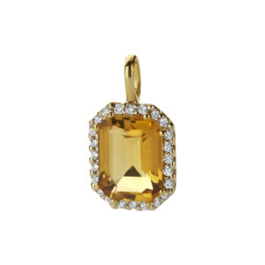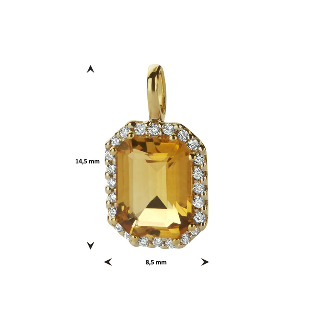 Deze hanger met citrien edelsteen en diamanten is gemaakt van 14 karaats geelgoud, de allerbeste kwaliteit geelgoud, met een fijntjes gepolijst oppervlak dat mooi glanst. Deze hanger bestaat uit een slank oogje waar u gemakkelijk een ketting naar keuze doorheen haalt, met daaronder een achthoekig plaatje dat langs de rand voorzien is van meerdere kleurloze 0,1crt diamanten die mooi glinsteren, met in het midden een achthoekige citrien edelsteen. Deze hanger heeft een afmeting van 8,5×14,5mm.