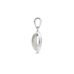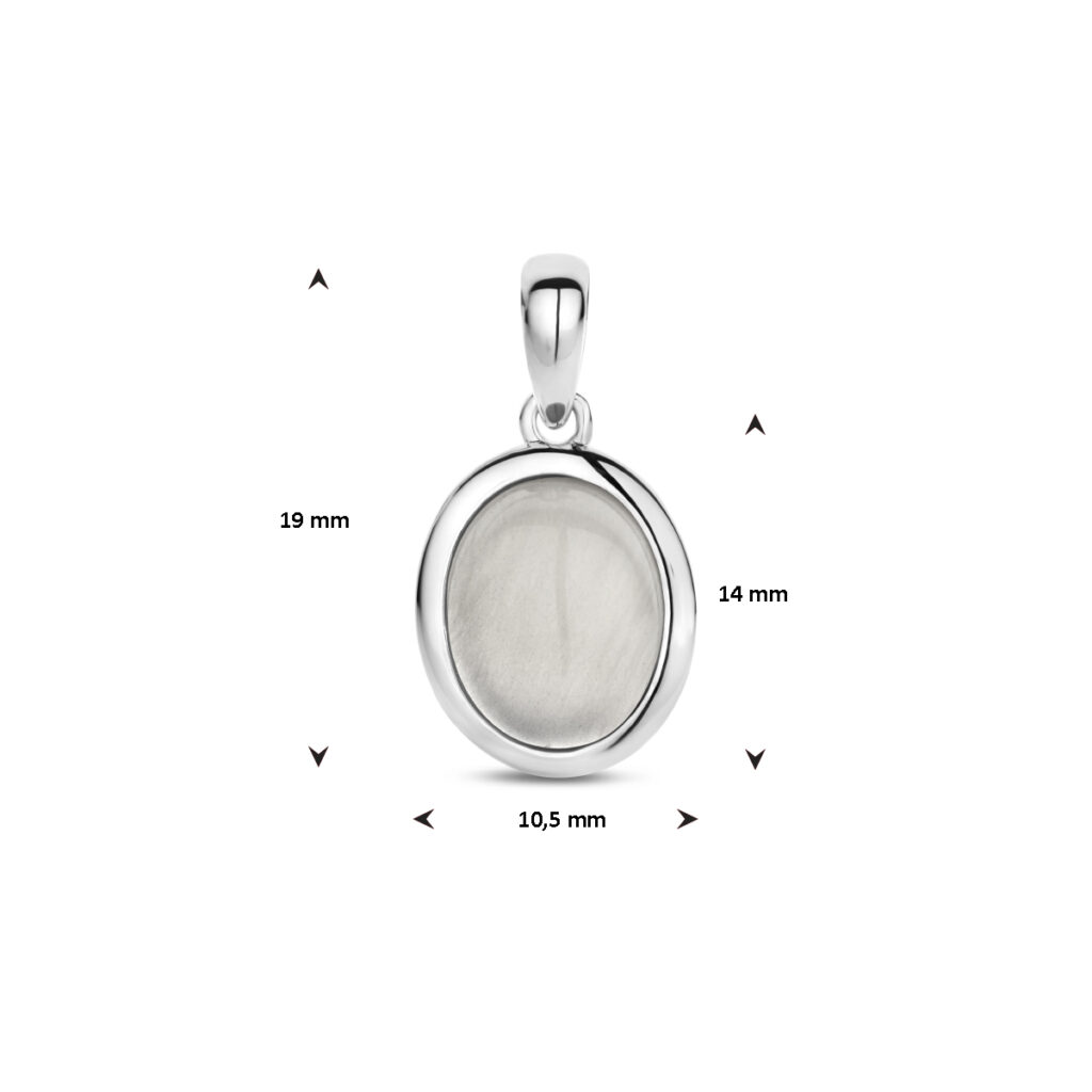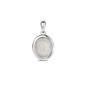 Gerhodineerd 925 zilveren hanger uitgevoerd met donkergrijs maansteen. De hanger heeft een afmeting van 14×10.5mm.