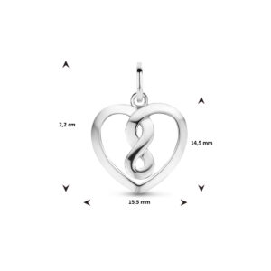 Deze prachtige hanger is volledig gemaakt van 925 sterling zilver, de allerbeste kwaliteit zilver, met een fijntjes gepolijst oppervlak dat mooi glanst en een laagje rhodium, wat ervoor zorgt dat de glans extra lang behouden blijft. Het sieraad bestaat uit een slank oogje, waar u gemakkelijk een ketting doorheen haalt, met daaronder een mooie hanger. Deze hanger heeft de vorm van een hart met in het midden een infinity teken. De hanger heeft een afmeting van 22 x 15,5 mm. De hanger is ook goed te combineren met de bijpassende oorbellen (13.35065).