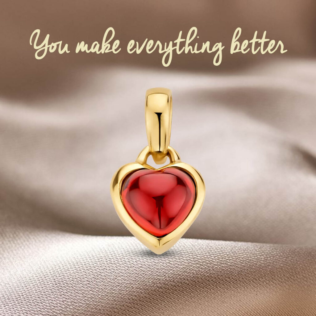 Deze schitterende hanger is volledig gemaakt van 14 karaat geelgoud, de allerbeste kwaliteit goud met een fijntjes gepolijst oppervlak dat mooi glanst. Het sieraad heeft de vorm van een hart, met in het midden een prachtige rode granaat steen. Aan de bovenzijde zit een slank oogje, waar u gemakkelijk een ketting doorheen haalt. Verder heeft het sieraad een totale afmeting van 11 x 6 mm en de hanger 6 x 6 mm.