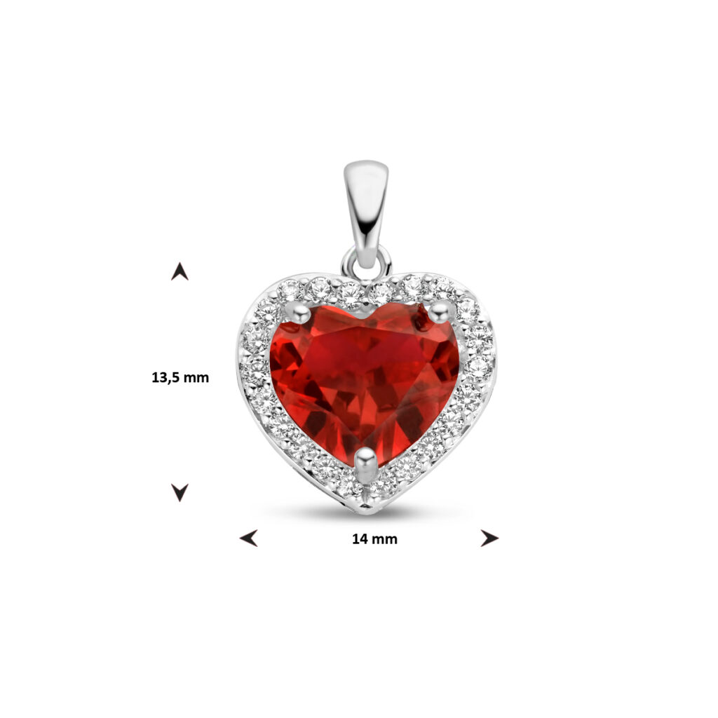 Prachtige Zilveren Zirkonia’s met Robijn Halo Hart Hanger die is vervaardigd uit 925 Sterling zilver dat is voorzien van een gerhodineerde beschermlaag, waarbij de Halo Hart Hanger een afmeting heeft van 13,5 x 14 mm. De Halo Hart Hanger is voorzien van in rijzetting geplaatste transparante, briljant geslepen zirkonia’s met in het midden een in Chaton zetting geplaatste transparant rode, hart geslepen synthetische robijn met een afmeting van 8,5 x 10 mm.