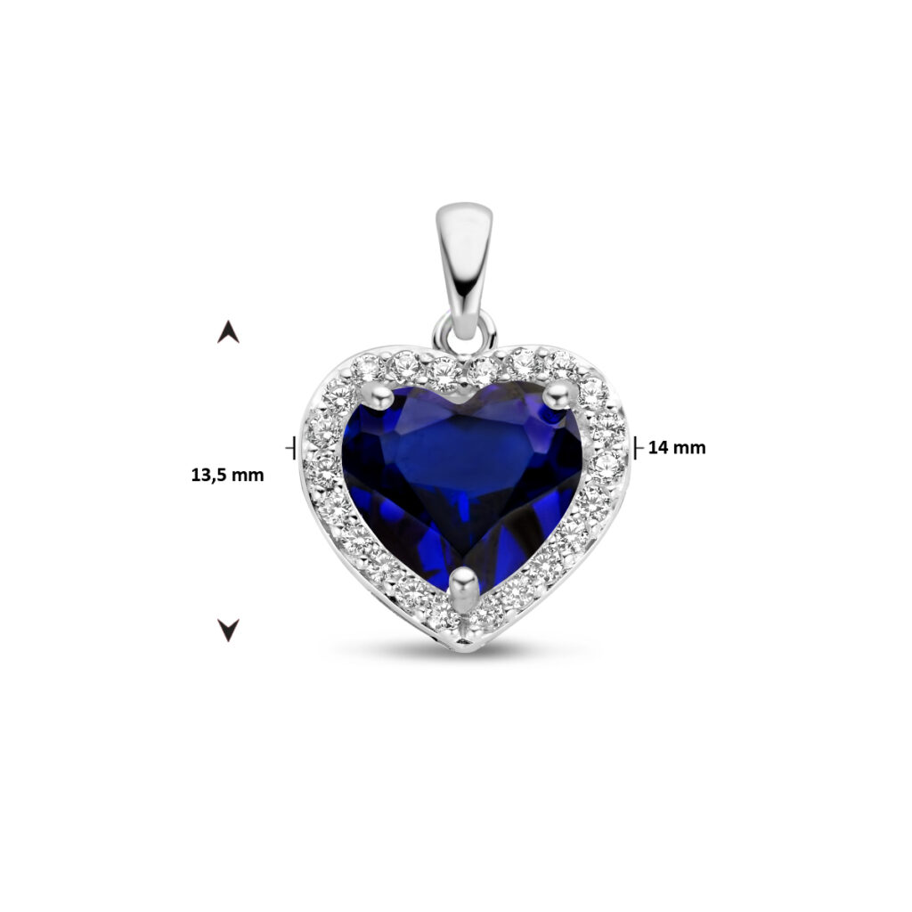 Elegante Zilveren Zirkonia’s met Saffier Halo Hart Hanger die is vervaardigd uit 925 Sterling zilver dat is voorzien van een gerhodineerde beschermlaag, waarbij de Halo Hart Hanger een afmeting heeft van 13,5 x 14 mm. De Halo Hart Hanger is voorzien van in rijzetting geplaatste transparante, briljant geslepen zirkonia’s met in het midden een in Chaton zetting geplaatste transparant blauwe, hart geslepen synthetische saffier met een afmeting van 8,5 x 10 mm.