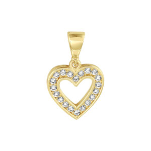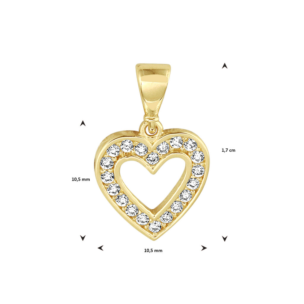 14k Geelgouden hanger in de vorm van een hart uitgevoerd met een schitterende zirkonia rij. De hanger heeft een totale hoogte van 1.7cm en een breedte van 10.5mm.