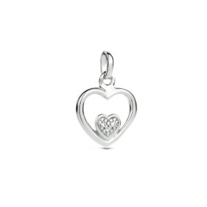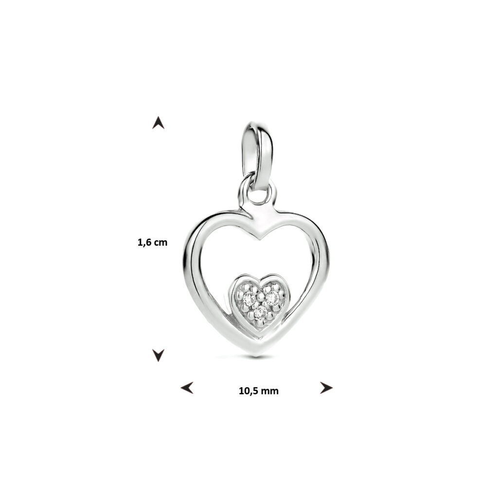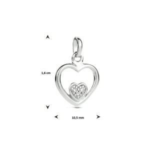 Gerhodineerd 925 zilveren hanger uitgevoerd in de vorm van een hartje met daarin heldere zirkonia. De hanger heeft een totale hoogte van 1.6cm en een breedte van 10.5mm.